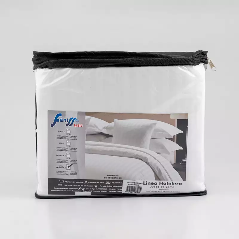 Juego de sábanas tamaño King 190 cm x 200 cm, color blanco, en tela sateen de poliéster, suave al tacto y fácil de lavar.