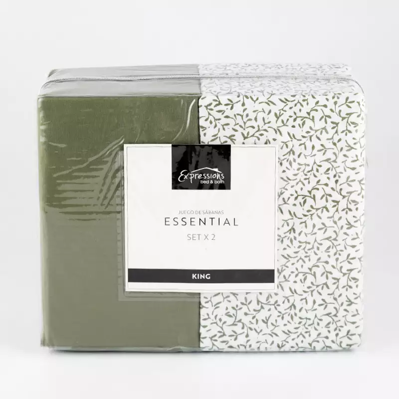 juego de sábanas Expressions Set Basic, tamaño King, disponible en Verde. Cada juego incluye dos unidades, hechas de 100% poliéster. Este material es suave, duradero y fácil de cuidar, lo que lo hace ideal para un uso diario cómodo