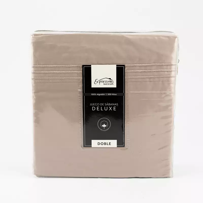 Juego de sábanas 100% algodón 300 hilos 4 Piezas Expressions taupe tamaño doble, incluye: 1 sábana ajustable + 1 sábana plana + 2 fundas de almohada