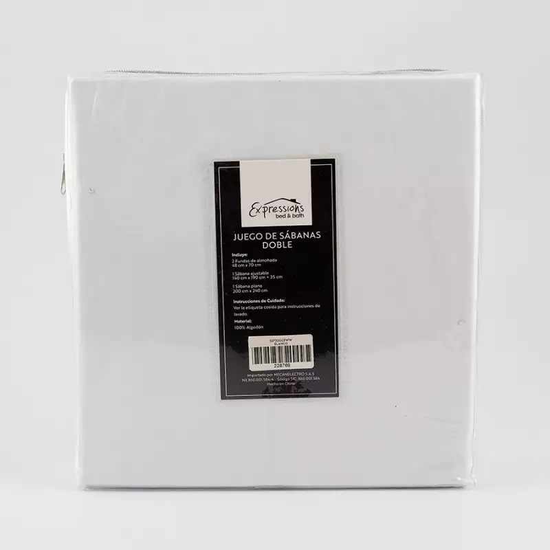 Juego de sábanas 100% algodón 300 hilos 4 Piezas Expressions blanco tamaño doble, incluye: 1 sábana ajustable + 1 sábana plana + 2 fundas de almohada