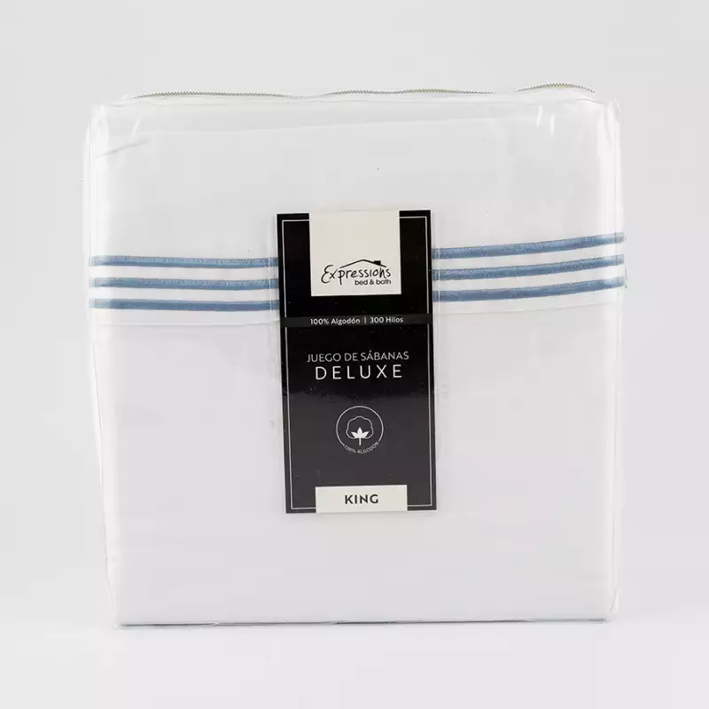 Juego de sábanas 100% algodón 300 hilos 4 Piezas Expressions blanco tamaño king, incluye: 1 sábana ajustable + 1 sábana plana + 2 fundas de almohada
