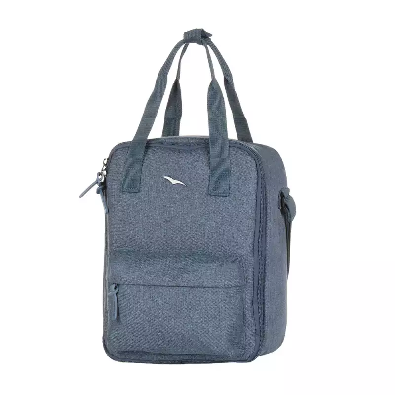 Lonchera Etern azul combina estilo y funcionalidad en un diseño sofisticado. Su amplio compartimento principal con cremallera garantiza seguridad, mientras que su bolsillo frontal de acceso rápido mantiene tus esenciales siempre a la mano. El forro interno impermeable y térmico conserva la frescura de tus comidas, asegurando su protección. Versátil y cómoda, puedes llevarla de dos formas: con manijas o correa de hombro.