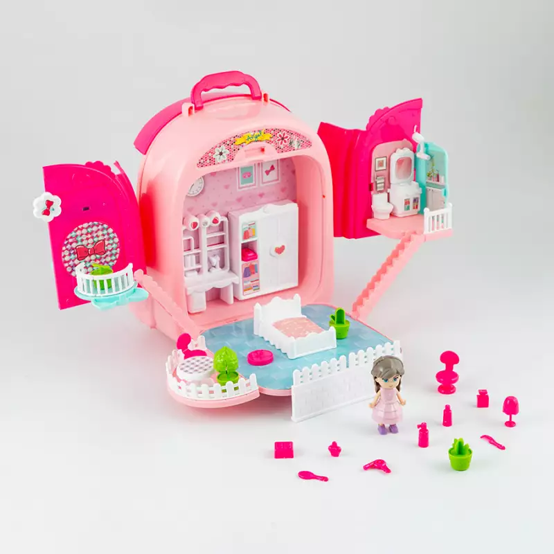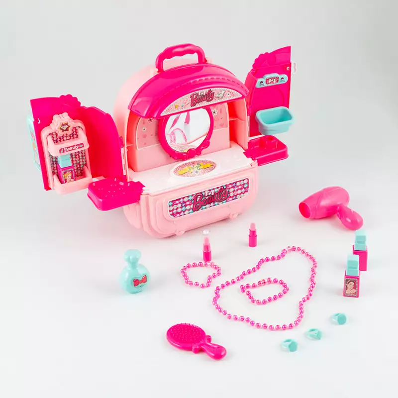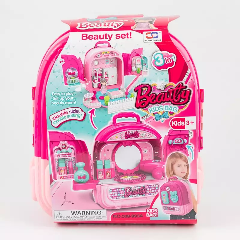 Juego de accesorios de belleza de moda, juego de simulación, incluye 1 mochila, 1 sticker, 9 flores, 18 accesorios varios, 1 cama, 1 taburete, 1 muñeca, 1 cuerda, 1 secador de cabello, 4 botellas, 2 labiales, 1 peine, 2 brazaletes de perlas, 1 collar de perlas, 3 anillos, 1 sostenedor, 1 manual de instrucciones, la mochila de maquillaje tambien cuenta con un diseño de bloqueo para mantenerla cerrada de forma segura cuando no està en uso, evitando que los accesorios se pierdan, fabricado en plastico de alta calidad, no toxico, proporciona educación mientras las infantes juegan y se divierten, promueve la coordinación manos - ojos, habilidades motoras finas, dimensiones del producto 26.3x15.2x30cm. Edad recomendada de uso mayor de 3 años.