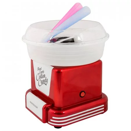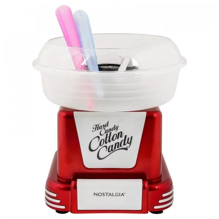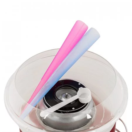 Máquina para hacer algodón de azúcar. Elaborada en plástico. El cabezal extractor especial funciona con caramelo duro sin azúcar y con azúcar par aalgodón. Parte superior en color transparente para la visión sencilla. La unidad se desensambla para una limpieza sencilla. Incluye dos conos plásticos reutilizables. Medida para azúcar y cabezal extractor. Diseño retro. Tiene cuatro ventosas en la base para evitar deslizamientos. Color rojo. Elaborado en China.