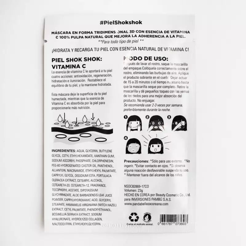 Esta máscara deja la superficie de tu piel humectada, mientras que el ácido ascórbico te ayuda a eliminar impurezas y la esencia de Aloe es absorbida por la piel para proporcionarle más nutrición. Después de lavar el rostro, saque la mascarilla del empaque. Colóquela correctamente sobre el rostro, eliminando las buburjas de aire. Aplique el producto sobrante en el cuello. Dejar actuar durante 15 minutos. Retire la mascarilla y dé pequeños toques con las yemas de los dedos para una mejor absorción del producto. No enjuagar.