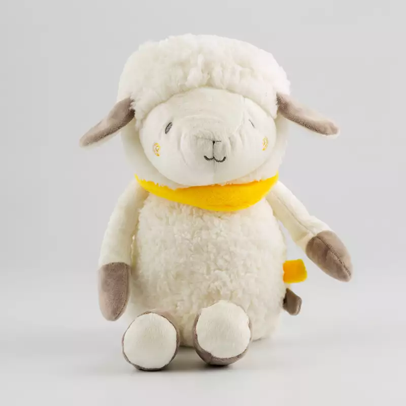 Peluche diseño oveja con sonidos y luces relajantes, fabricado de material felpa de alta calidad, ideal para acompañar a tu niño en su juego diario, listo para abrazar a la hora del sueño, tambien utilizado como decoración para dormitorio, incluye instrucciones, 1 destornillador, caja musical, requiere 3 pilas AA no incluídas dimensiones del producto 15x10x22cm. Edad recomendada de uso mayor de 6 meses.