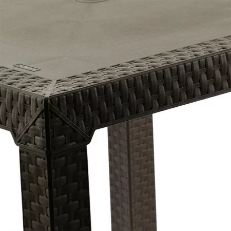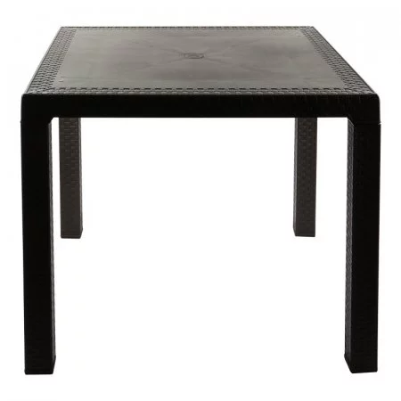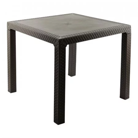 Mesa elaborada en plástico. Color café. Apariencia tipo rattan. Superficie rugosa. Contraste mate. Practica. Amplia. Espaciosa. De fácil ensamblaje. Forma cuadrada. Ideal para todo tipo de espacio. Resistente. Duradera. Patas cuadradas.