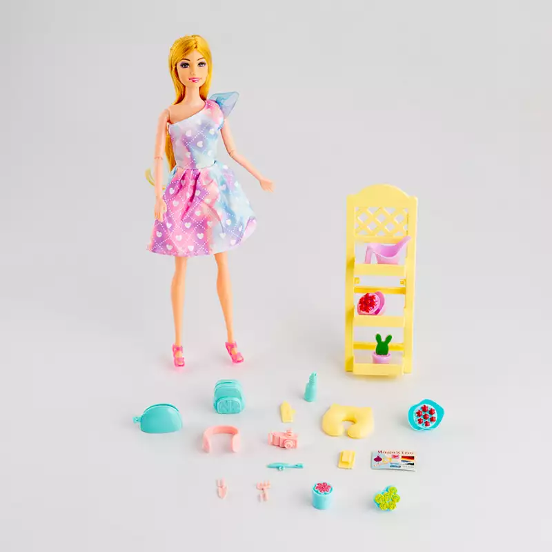 Muñeca fashion jardinera con acesorios, diseñada con materiales de calidad, lindo atuendo, su extructura garantiza que la infante pueda jugar en cualquier lugar, interior o exterior sin preocuparse, faciles de lavar, promueve la creatividad e imaginación, perfecta para fomentar el juego de rol, incluye 1 estante, 6 floreritos, 3 herramientas, 3 tarjetas de papel, 1 camara, 1 cuchillo, 1 calentador de agua, 1 botella, 1 almohada, 1 maleta, 1 auriculares, 1 celular, dimensiones del producto 32x7x32.5cm. Edad recomendada de uso mayor de 3 años.