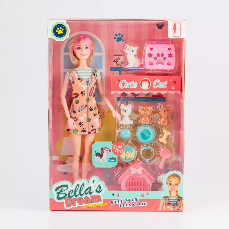Muñeca fashion veterinaria con acesorios y mascotas, diseñada con materiales de calidad, hermoso atuendo, su extructura garantiza que la infante pueda jugar en cualquier lugar, interior o exterior sin preocuparse, fáciles de lavar, promueve la creatividad e imaginación, perfecta para fomentar el juego de rol, incluye 1 jaula, 1 casa, 5 cachorros, 2 tarjetas de papel, 1 peine, 2 platos, 1 hueso, 1 hueso de pescado, 1 bola, 1 collar, dimensiones del producto 23x6x32.5cm. Edad recomendada de uso mayor de 3 años.
