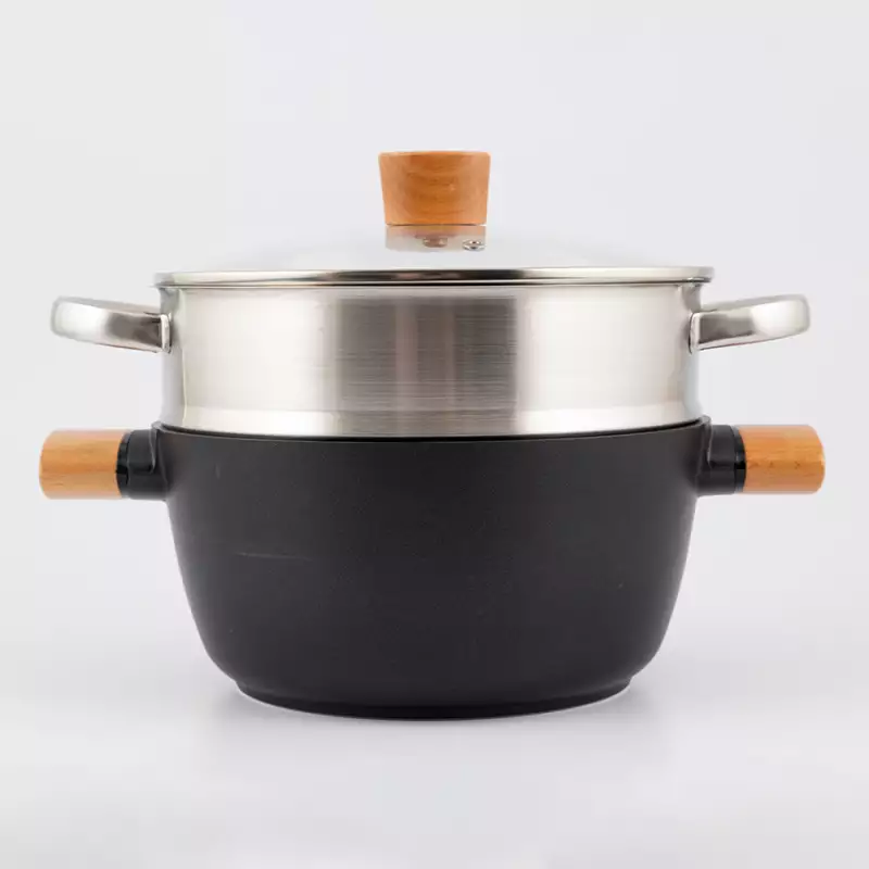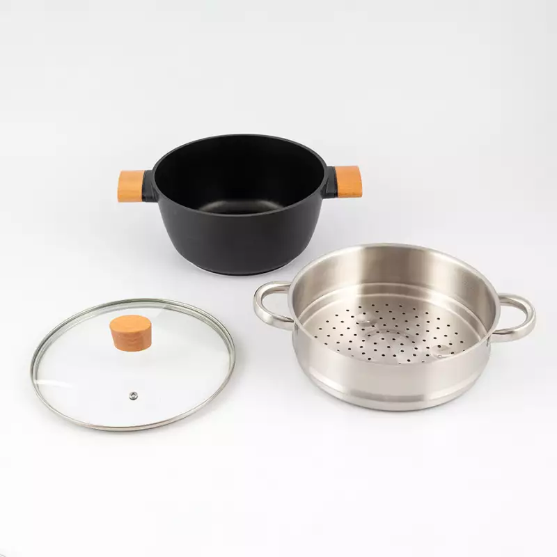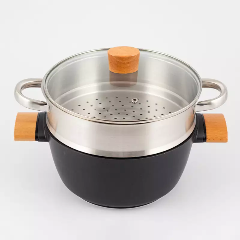 Olla vaporera con woody 151405 Colores: Negro y plateado Materiales: Aluminio antiadherente y hierro fundido Medidas: 24x33x33 Cmts Capacidad: 24Cmts Marca: Simply Smart