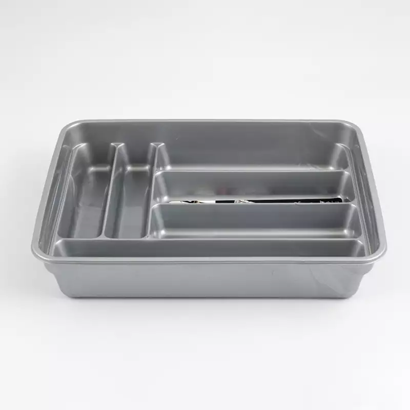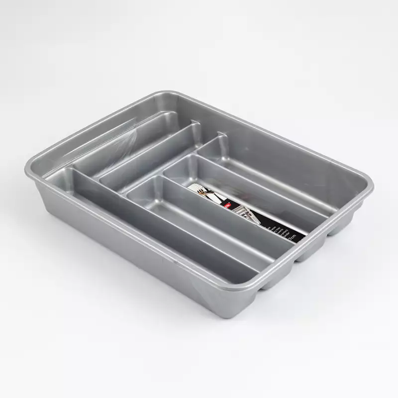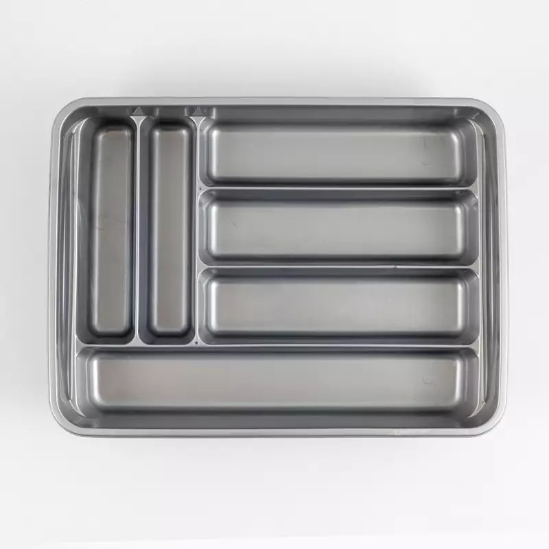 Organizador Plasticforte 40x7x30 cm Gris Plata – Ref. 1159712 Fabricado en plástico resistente con acabado en color gris plata. Su diseño práctico y funcional permite organizar fácilmente utensilios de cocina. Con medidas de 40 cm de frente, 7 cm de alto y 30 cm de fondo, se adapta perfectamente a cajones estándar, aportando orden y aprovechamiento del espacio. Producto ligero (0,37 kg), fácil de limpiar y duradero, ideal para mantener la cocina organizada. Fabricado en España.