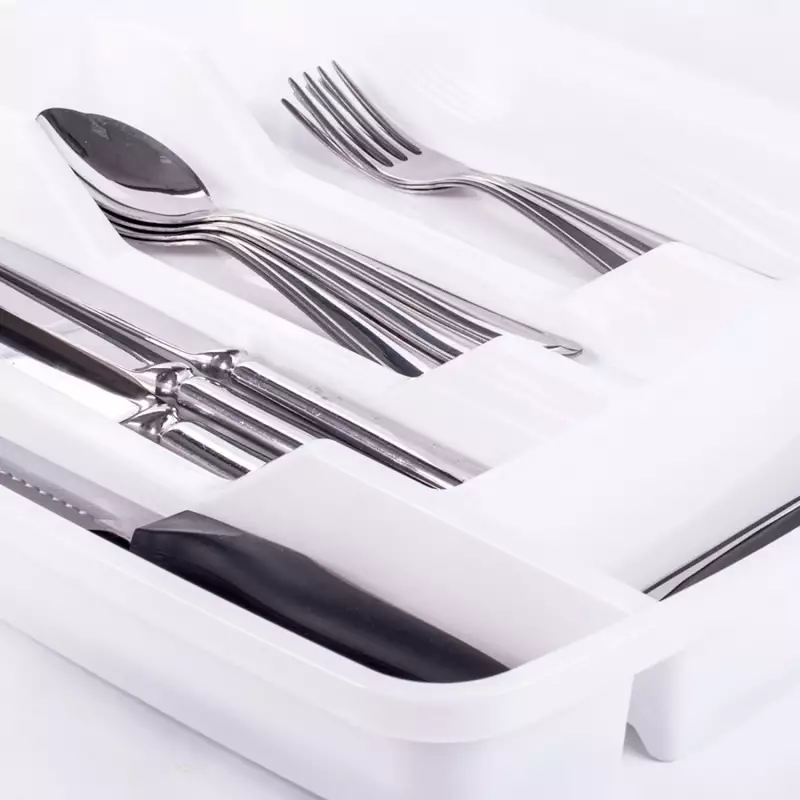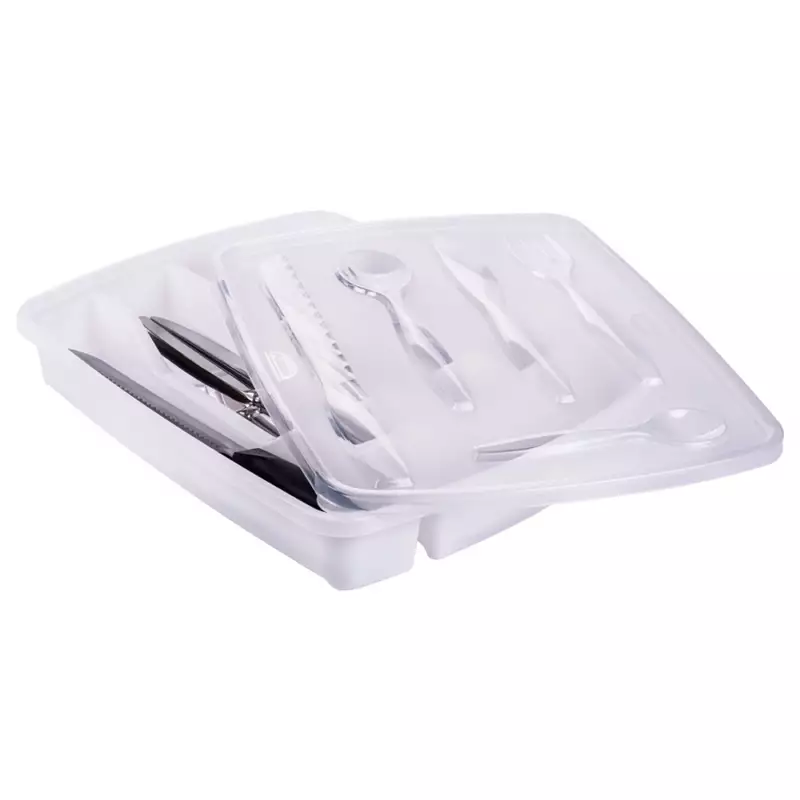 Porta cubiertos con 5 divisiones y tapa transparente para una fácil visualización de los cubiertos.