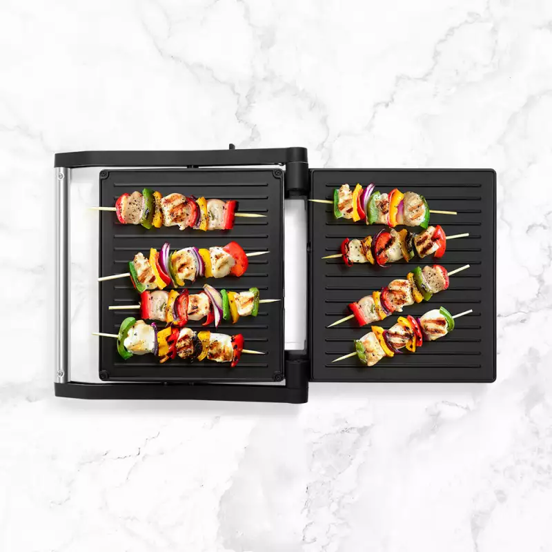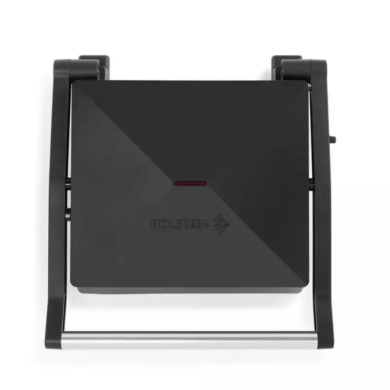Variante en negro, con 1000 W, dos placas antiadherentes, diseño compacto y funcional, controles básicos, luces indicadoras y hortaleza para uso doméstico diario.