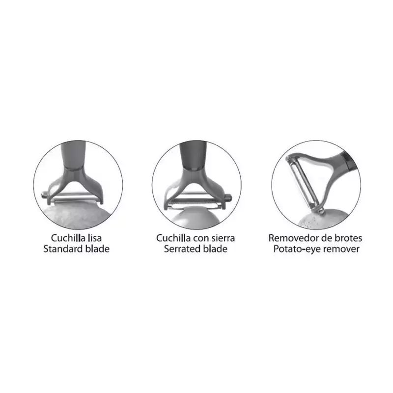 Mango En Plástico Y Goma Antiresbalante Con Función En Plástico De Alta Resistencia Y Acero Inoxidable. Con Cuchilla Lisa Standard Blade Y Otra Cuchilla Con Sierra Serrated Blade Y Removedor De Brotes. Cuidados; Antes De Utilizar, Lavar Con Agua Y Secar Inmediatamente. No Se Debe Exponer Al Calor, Ni Colocar Directamente Sobre Superficies Calientes. Cuchilla Afilada, Manipular Con Cuidado Y Mantener Fuera Del Alcance De Los Niños. Uso: Diseñado Para Quitar Las Cáscaras O Cortezas De Verduras Y Frutas. Con Dos Cuchillas Para Diferentes Tipos De Pelado. Contenido: 1 Pieza.