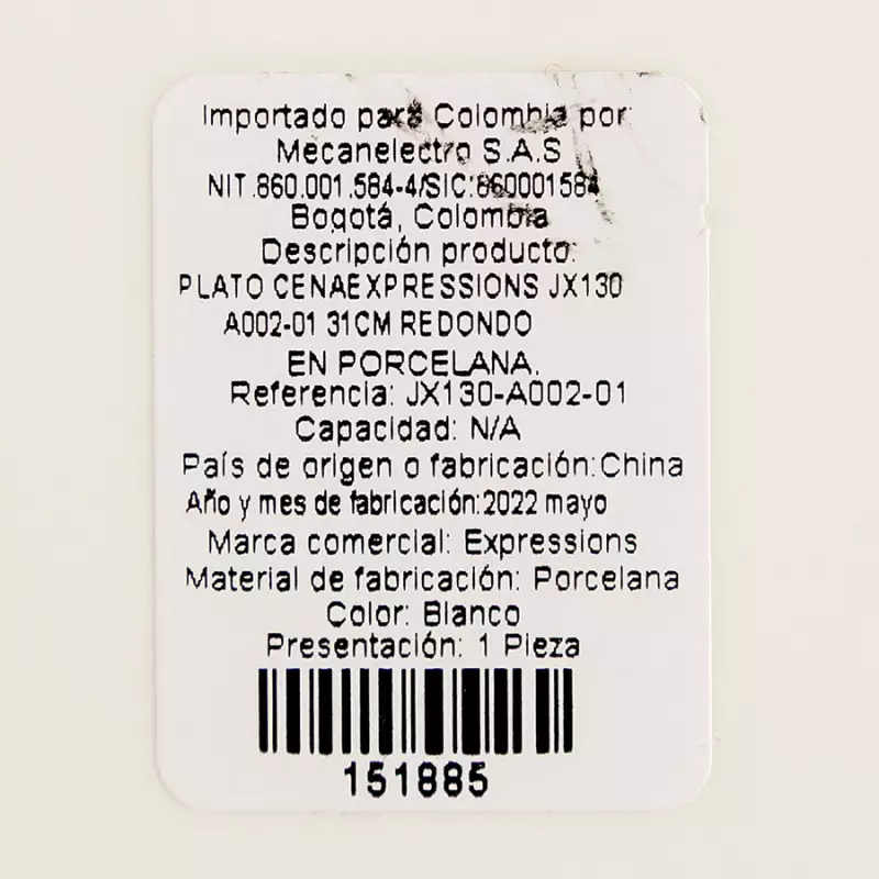 Plato Cena Expressions Redondo 31 Cm Blanco Vidrio Opal Jx130-A00