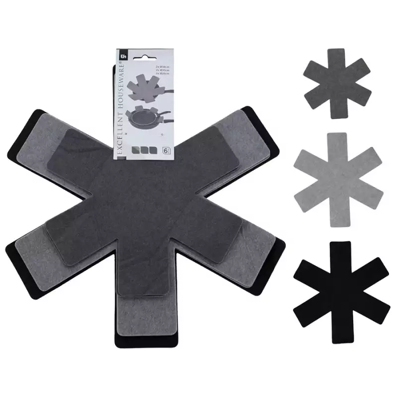 Protector excellent houseware set X6 felpa ollas / sartenes surtidos 101001370. Conjunto de protector de sartén de 6 piezas, material de fieltro, 3 tamaños y colores diferentes por juego: diámetro 38 cm, diámetro 35 cm y diámetro 26 cm, espesor 2 cm, 220 g/m², 100 porciento poliéster. Los productos marcados como 'producto surtido' pueden no ser idénticos a los que aparecen publicados en las imágenes, las imágenes son ilustrativas, al comprar un producto identificado como producto surtido, aceptas que podrás recibir un producto con características y atributos tangibles diferentes a los que aparecen en las imágenes del sitio o la publicidad, los productos surtidos mantendrán las propiedades físicas, químicas y técnicas necesarias para su funcionamiento y uso de acuerdo a su naturaleza.
