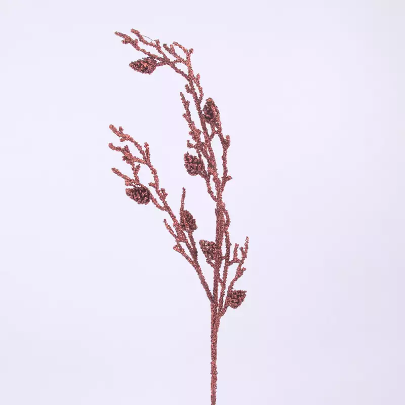 Decora con estilo natural y sofisticación. Esta rama de 76 cm en tela color café es ideal para completar arreglos navideños, coronas, centros de mesa o guirnaldas, aportando altura y textura a tus espacios.