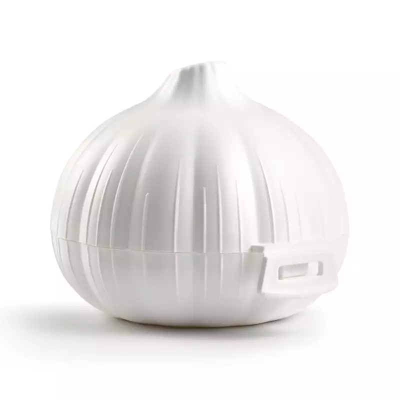El recipiente Plasticforte para ajos, de color blanco, está fabricado en plástico resistente y tiene una capacidad de 0,35 kg. Con dimensiones de 9x10x9 cm, y un peso ligero de 0,04 kg, es un accesorio ideal para mantener los ajos organizados, frescos y al alcance en la cocina, contribuyendo al orden y la conservación de ingredientes esenciales.
