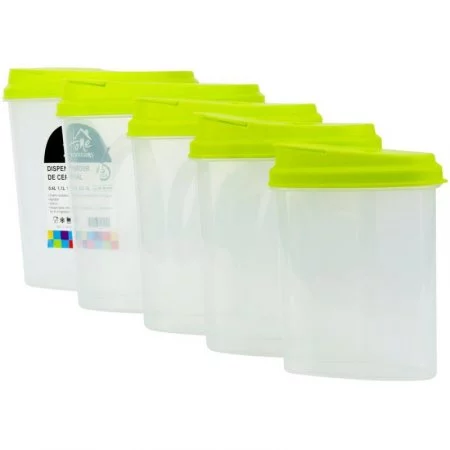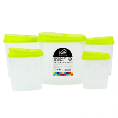 Dispensador de cereal 5 piezas elaborado en plástico diseño duradero seguro para lavavajillas y apto para almacenar en el congelador incluye recipientes con capacidades de 0.6 litros 1.1 litros 1.8 litros 2.7 litros y 4 litros cada uno con tapa.
