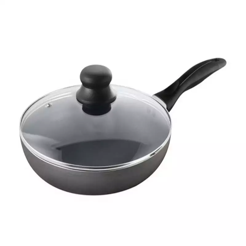 Sartén de aluminio prensado 1.4 mm, color gris, con tapa de vidrio templado y mangos de baquelita remachados, y elaborada con 5 capas de recubrimiento antiadherente.