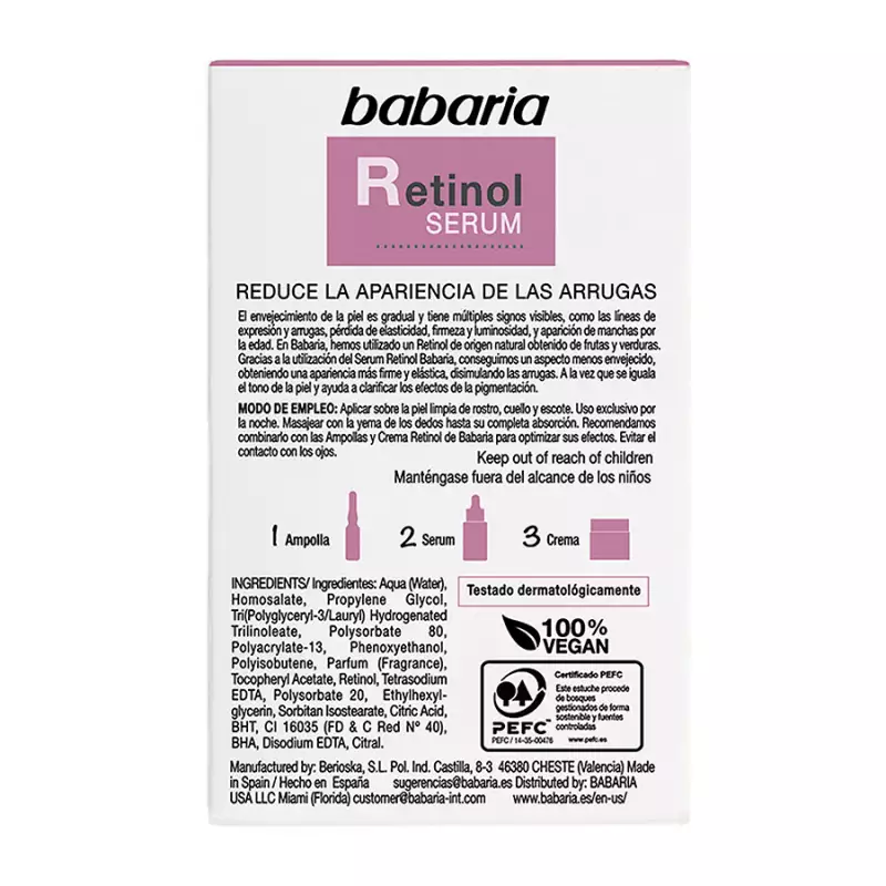 En Babaria hemos utilizado un Retinol de origen natural a base de frutas y verduras. Gracias a la utilización del Serum Retinol Babaria conseguimos luchar contra el envejecimiento, obteniendo una piel más firme y elástica, reduciendo las arrugas de toda la cara: frente, patas de gallo, ojos y barbilla, así como igualando el tono de la piel, a la vez que se mejoran los efectos de la pigmentación, ya que regula la expresión de la tirosinasa e inhibe la síntesis de melanina. Serum de tacto ligero y absorción rápida. Uitlizar unicamente en la noche