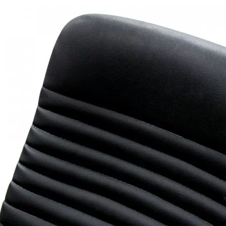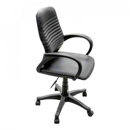 Material sintético. Palanca que gradua la elevacion en el lateral. Color negro. Tiene brazos en plástico. Espaldar con costuras. Base con cinco ruedas. Practica. Cómoda. Para todo tipo de espacio.