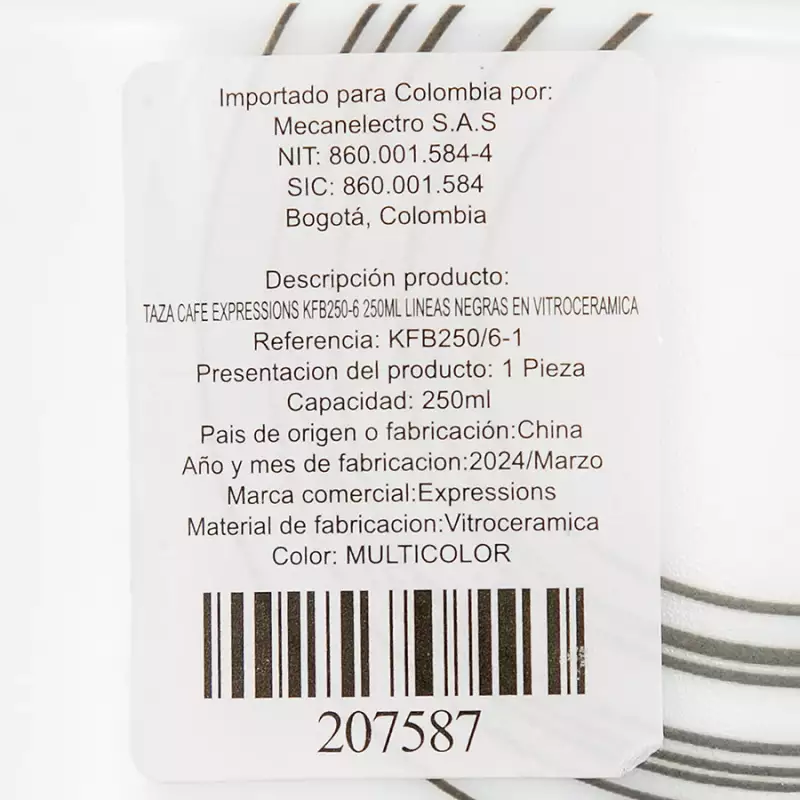 Taza café 250mlMaterial: VitroceramicaColor: BlancoDiseño: Semi Circulos Forma: RedondoTipo: TazaMarca: Expressions tabletops Medidas: alto: 6,5 cm Diametro: 8,5cm Apto para lavaplatos: SI Apto para horno microondas: SI. Kfb250-6