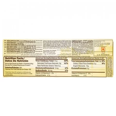 Turrón de almendra con sal marina. Elaborado con almendras, azúcar, miel. Oblea aceite de girasol. Calorías 220.