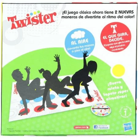 Twister es el juego que hará que los niños se diviertan mientras se retuercen. Además de los clásicos movimientos que tiene Twister esta renovada versión cuenta con dos nuevos movimientos que podrán salir al girar la ruleta. ¡Con estos movimientos se conseguirán aún más enredos! 1 tapete Twister 1 ruleta con basey flecha Instructivo 6 AÑOS EN ADELANTE