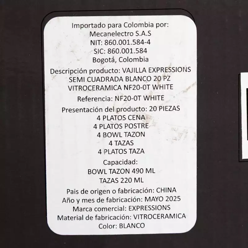 Vajilla Expressions Semi Cuadrada Blanco 20 Pz Vidrio Opal NF20-0T WHITE