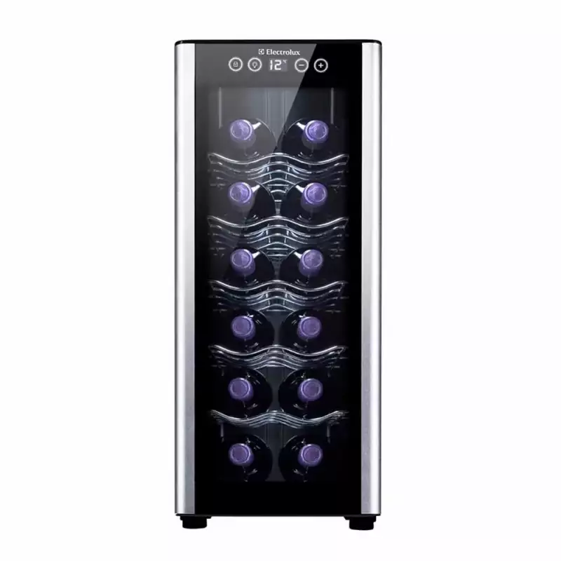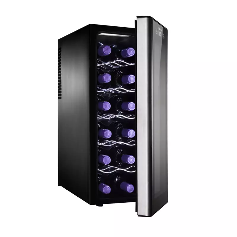 Una vinera elegante en negro, con capacidad de 33 litros y dimensiones pensadas para integrar en espacios reducidos. Dispone de panel táctil de control de temperatura, iluminación interior, estantes cromados extraíbles y sistema de enfriamiento termoeléctrico silencioso, sin compresor