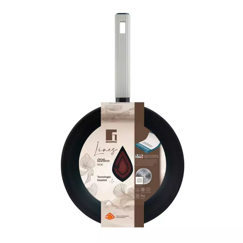 Wok, Negro - 26 CM Elaborado en aluminio forjado, . antiadherente Ilag Essential asas con efecto "frio al tacto" libre de PFOA apta para todo tipo de estufa tecnología Heatdot con un diseño moderno. Complementa los accesorios de tu cocina con este Wok de la colección líneas de Bergner, en el cual podrás disfrutar de múltiples recetas y preparaciones para compartir con familiares o amigos en cualquier ocasión ¡no esperes más, anímate a llevarlo ahora! La garantía aplica para defectos de fábrica (manijas o mangos sueltas, desprendimiento de disco difusor, desprendimiento del antiadherente sin evidencia de manipulación con utensilios corto punzantes) cada producto tiene descrito en el empaque su garantía, usos y cuidados. La garantía no aplica si el producto tiene signos de mal uso como rayones, raspaduras o golpes, para más información sobre usos y cuidados puede acceder al siguiente link: https://bergnerlatam.ac-page.com/expertos-en-sartenes