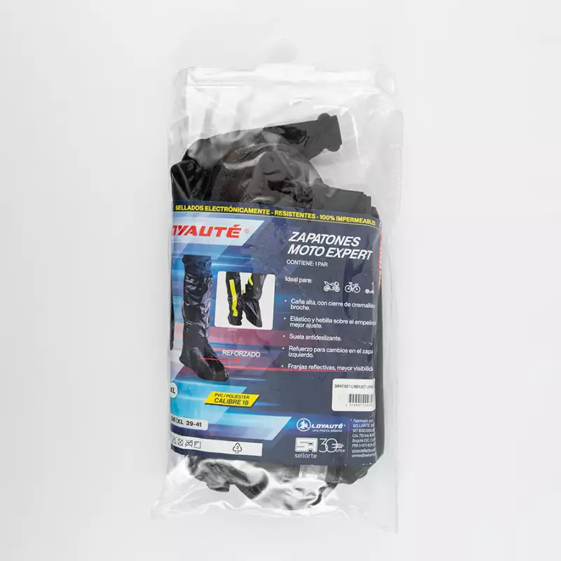 Zapatones impermeables sellados por alta frecuencia. Caña alta, con cremallera que permite apertura total del zapatón para introducir el pie con facilidad. Reflectivo en la parte posterior y caucho con hebilla de ajuste sobre el empeine para que no se deslicen. Suela antideslizante. Pvc con soporte poliester calibre 18. Reforzados en el empeine del pie para los cambios, para mayor durabilidad. Color negro. Para uso a la intemperie. Es ideal para movilidad en moto, bici, eléctrica.