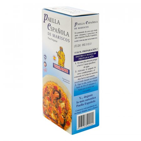 Paella Española de Mariscos Para Preparar Vigilante 549g-Blanco Paella Artesanal para preparar, auténtico sabor español en tu mesa.Ingredientes: Arroz, sal, paprika, calamares, merluza, guisantes, mejillones, pimientos morrones, berberechos, aceite vegetal, agua, cebolla, tomate, especias. Registro Sanitario RSIA05M75593 Medidas en Centimetros: 22x6x9