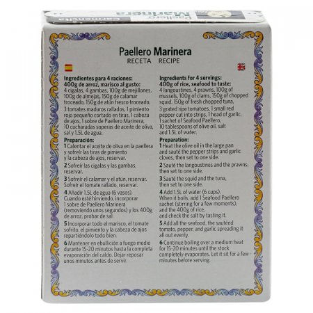 Set de tres sobres de paellero elaborados con ajo desidratado, sal, pimenton dulce, pimienta negra, limon desidratado, maltodextrina, perejil , clavo Los tres sobres equivalen a 12 raciones Libres de gluten De fácil preparación Contenido total de 12gr Elaborado en España Registro RSiA 17I69312