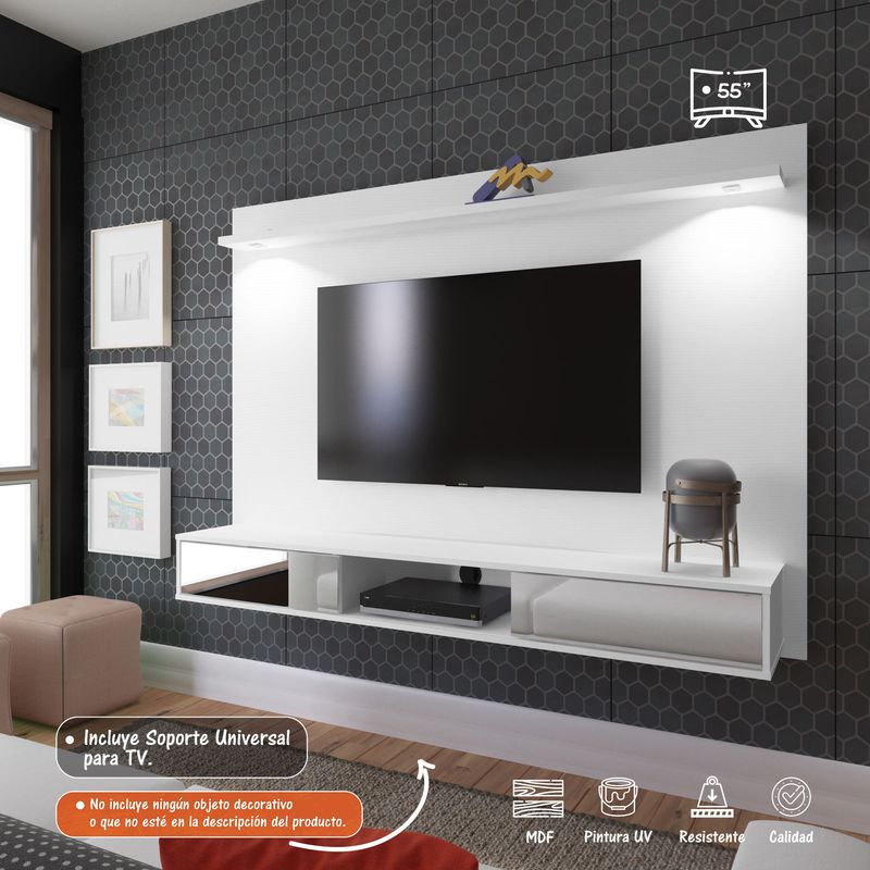 Además, cuenta con nichos para aparatos electrónicos, entrepaños, espacio para “Pantalla de hasta 55”. Ya viene con los herrajes para fijar la pantalla al panel, lugares para accesorios y/o decoraciones, sistema de cables ocultos.