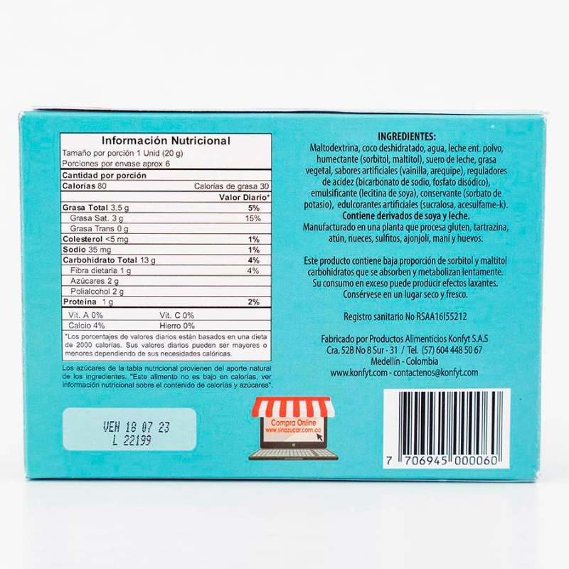 Deliciosa golosina tradicional endulzada con sucralosa. Mezcla de caramelo de leche y coco fresco. Elaboradas con leche UHT. Libre de grasa trans. Sólo 96 calorías por porción. Elaboradas sin harina de trigo. Apto para personas que no pueden o no desean consumir azúcar. Compatible para personas diabéticas, dentro de las restricciones de una dieta con supervisión médica.