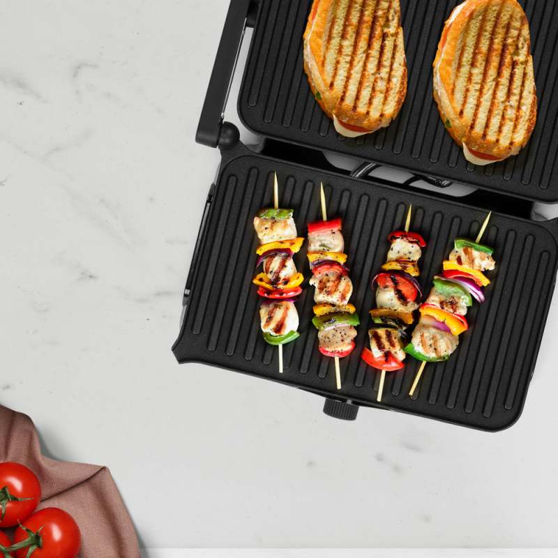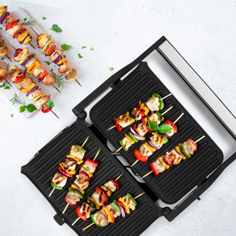 Grill tipo panini de dos planchas (2 puntos calientes), con 1200 W de potencia, placas antiadherentes, bisagra ajustable para diferentes grosores de sándwiches, indicador luminoso y diseño en acero inoxidable. Perfecto para tostar emparedados y grillados ligeros.