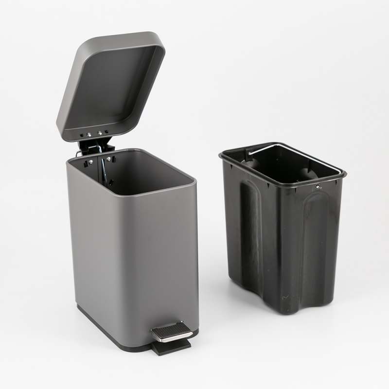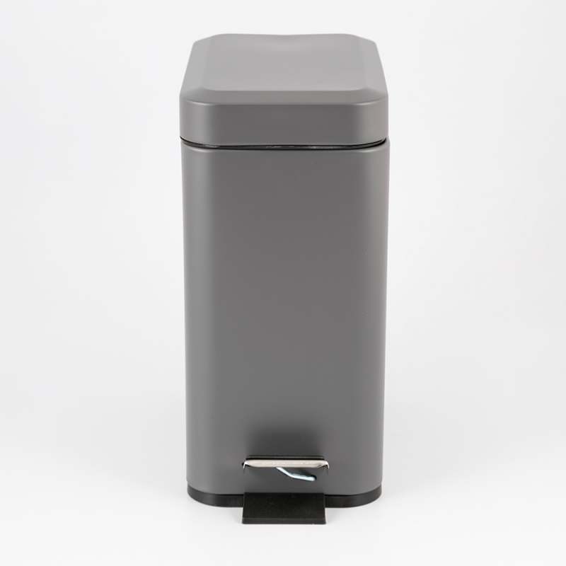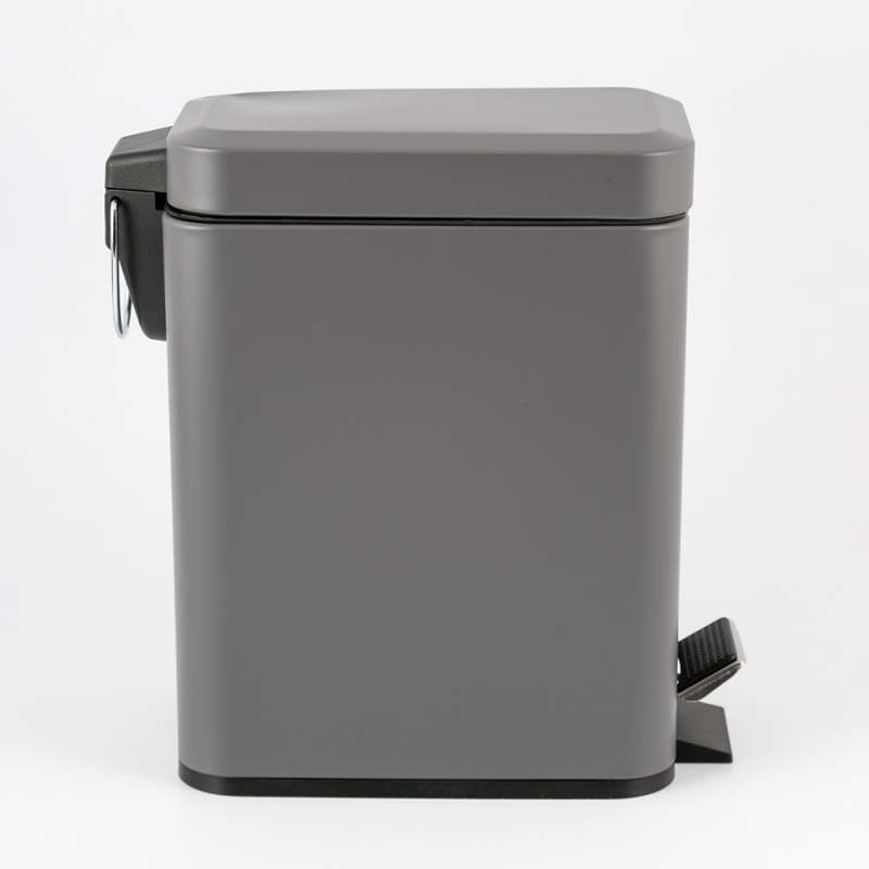 Papelera de acero con capacidad de 5 litros y acabado gris. Diseño moderno y discreto, adecuada para baño, habitación u oficina.