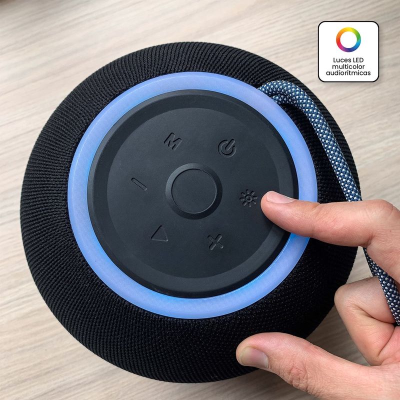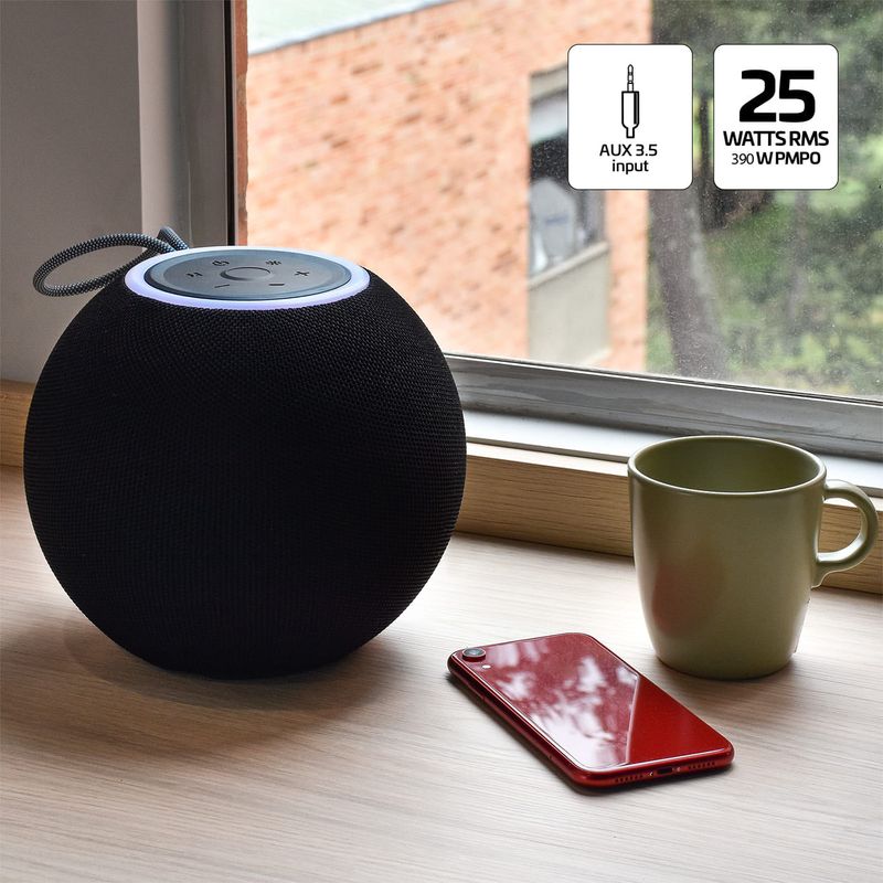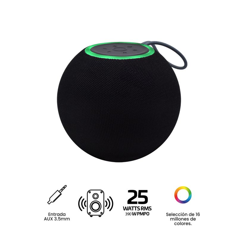 Sumérgete en una experiencia sonora vibrante con el Parlante Inalámbrico VTA 25W Sphere Beat. Este parlante esférico recargable solo te ofrece un sonido potente y claro, sino que también convierte cada canción en un espectáculo visual gracias a sus luces LED rítmicas, que se adaptan a tus estilos musicales. Su diseño compacto con correa de agarre facilita su transporte, para que lleves la música contigo a cualquier lugar. Con tecnología Bluetooth 5.3, y múltiples opciones de conexión como USB, Micro SD y auxiliar de 3.5mm, podrás disfrutar de tu música favorita con total libertad y en el formato que prefieras.