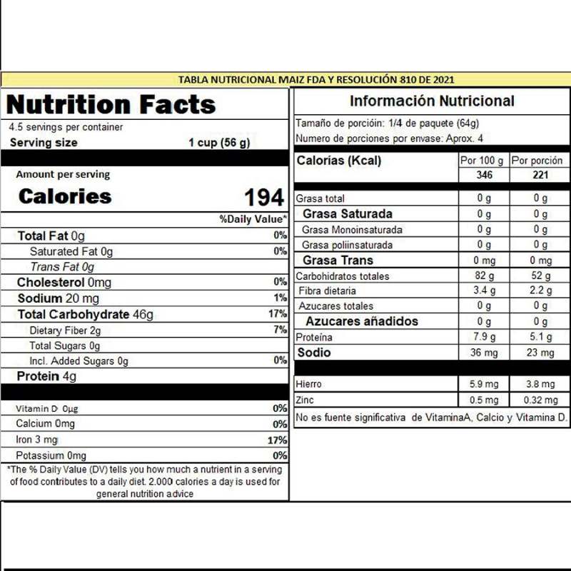 Ingredientes harina de maíz amarillo Presentación Contenido neto: 250 gramos (8.8 onzas). Instrucciones de uso Tiempo de cocción: 11-12 minutos. Cocción: -Por cada 100 gramos de pasta, hervir en una olla honda 2 litros de agua y 10 gramos de sal. -Al ebullir, agregar la pasta y revolver de vez en cuando. -Escurrir en colador.