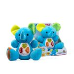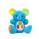 Peluche educativo con luz y sonido con forma de Elefante. El peluche es de color azul y tiene la cabeza, las patitas y los brazos de material blandito (poliéster), mientras que el cuerpo es de material duro (plástico).