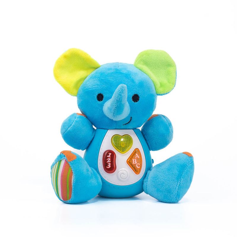 • Peluche con forma de Elefante que habla, tiene sonidos y luces parpadeantes de colores