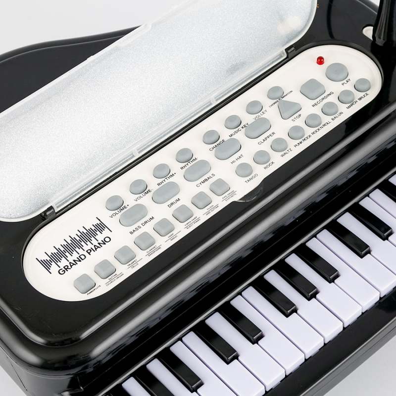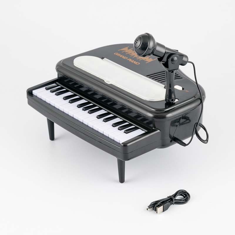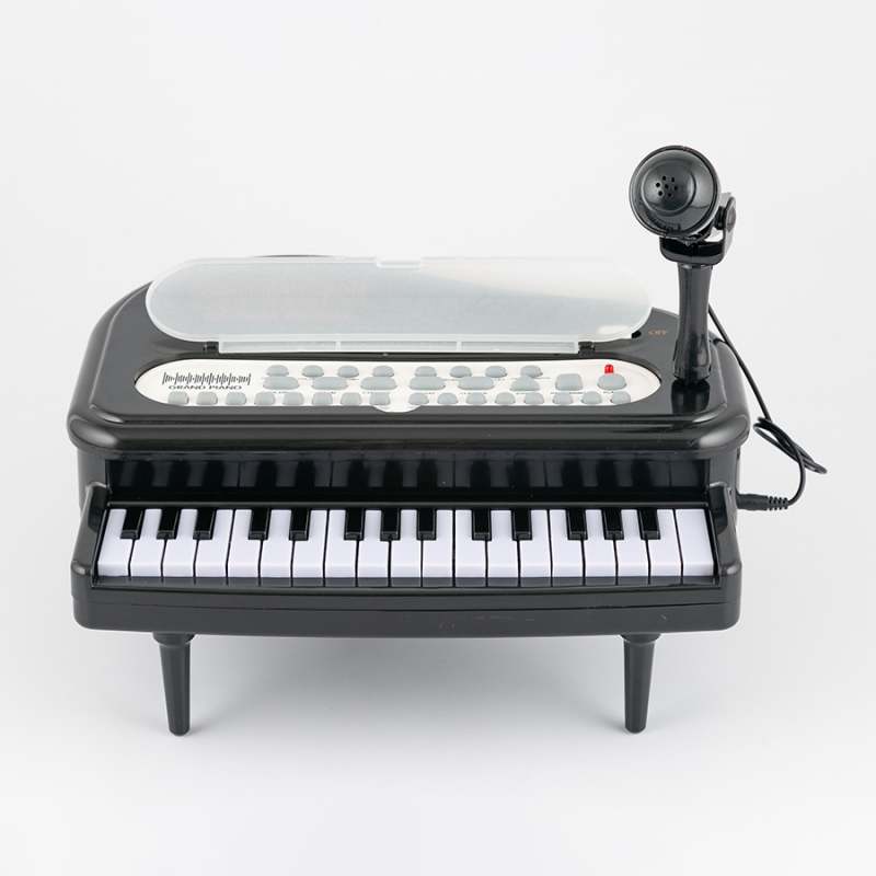Piano de juguete color negro, perfecto para niños en las primeras edades, especialmente para preescolares, desarrolla la coordinación mano-ojos de los niños, la cognición de la teoria musical y estimula la audición, cuenta con un micrófono externo, 4 patas,1 linea usb que permite que tu hijo no sólo sea un pianista, sino tambien un cantante, requiere 4 pilas AA no incluidas, dimensiones del producto 33x8.5x29.5cm. Edad recomendada de uso mayor de 3 años.