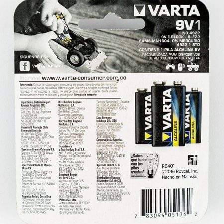 MiniMarketPilas CargadoresPilas 9 VoltiosPila 9V Varta Alcalina 4922-1 Std