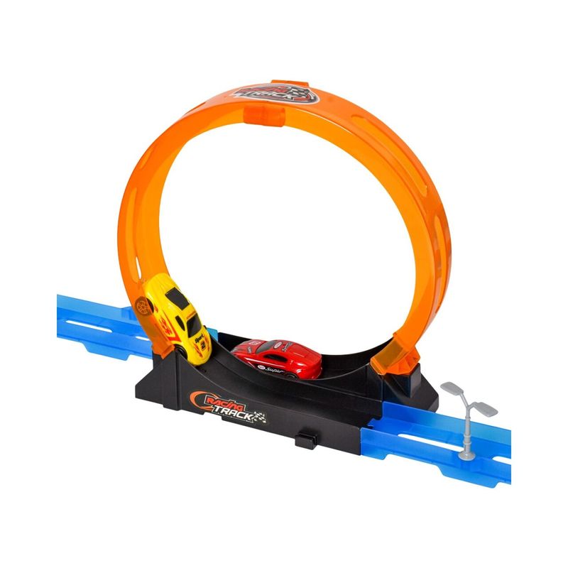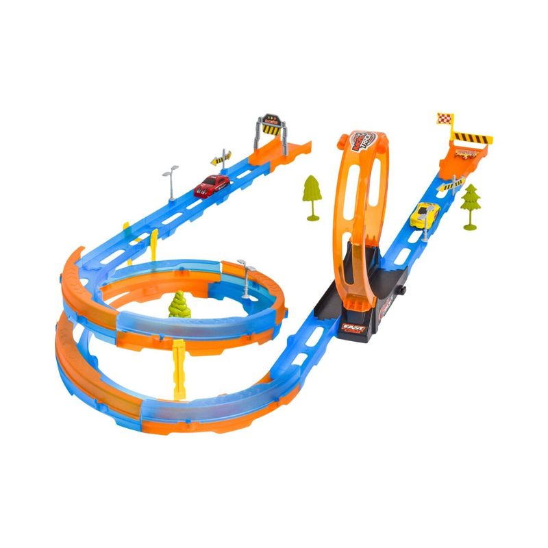 La Pista Super Track con 2 Carros Max Racer permite organizar competencias entre dos vehiculos diecast en un circuito armable con tramos elevados y giro de 360 grados. Su ensamble flexible permite modificar el recorrido según la imaginación de los niños, quienes desarrollan coordinación mano ojo, lógica espacial y resolución de problemas mientras prueban nuevas configuraciones y desafían la velocidad de los carros.