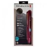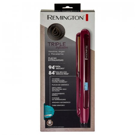 Plancha para el cabello S7740. Marca: Remington. Elaborada en cerámica, placas extralargas, tiene 10 horas de protección contra humedad, tiene 230°c/450°f temperatura máxima de salón, tiene 9 niveles de temperatura, tiene triple infusión de keratina argán y macadamia, brinda un cabello 94% más sedoso, 84% más brilloso con menosfrizz, incluye bolso resistente al calor, placas flotantes, calentamiento rápido, nueve niveles de temperatura, apagado automático, cable giratorio de salón que no se enreda, cierre de seguridad, luz indicadora led. Medidas: 31 x 4 x 6 Peso: 0.5.
