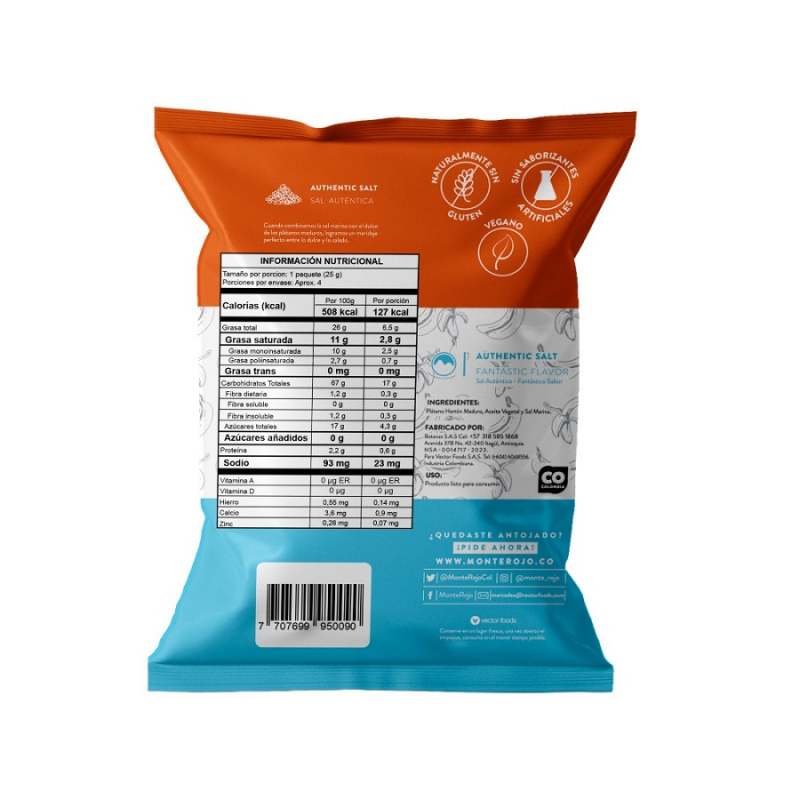 Chips de plátano maduro con el toque preciso de sal marina que combinadas logran un maridaje perfecto entre lo dulce y lo salado. Sin grasas trans, sin colesterol y sin gluten.
