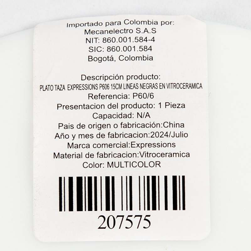 Plato taza. Marca: Expressions Tabletops. Material: Vitroceramica. Color: Blanco. Diseño: lineas negras. Forma: Redondo. Tipo: Plato taza. Medidas: alto: 2 cm Diametro: 15 cm. Apto para lavaplatos: SI Apto para horno microondas: SI