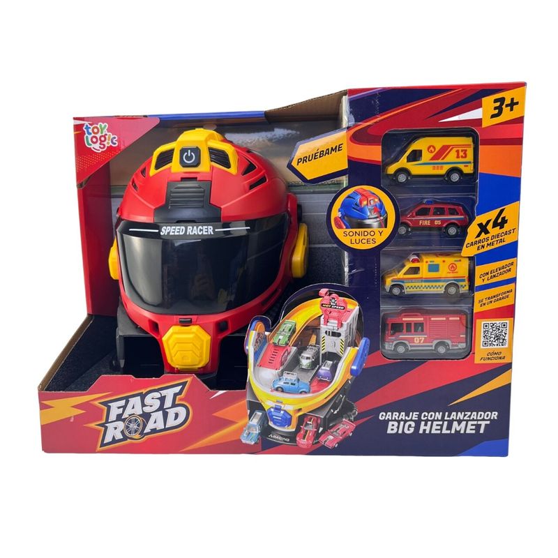 Prepara la acción con el Playset Garage Fast Road. Incluye un lanzador potente y un auto diecast Big Helmet para competir a toda velocidad. Su diseño resistente y fácil de armar ofrece horas de diversión, ideal para niños que disfrutan de las carreras y los desafíos de precisión. Perfecto para crear tus propias aventuras sobre ruedas.